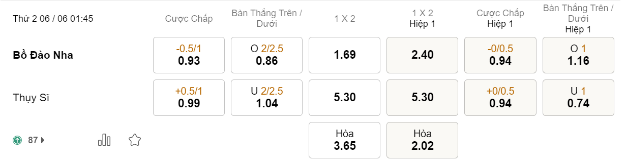Tỉ lệ kèo Bồ Đào Nha vs Thụy Sĩ