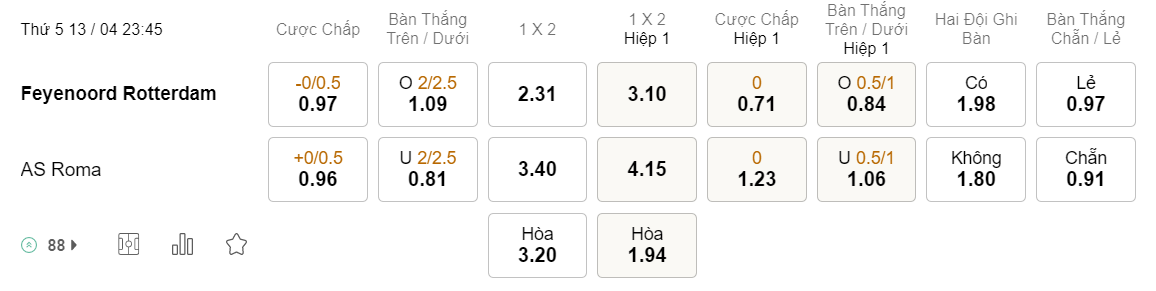 Trong khi đó nhìn sang Roma, họ thường chơi tệ mỗi khi xa nhà với minh chứng là kết quả 3 thất bại, 1 hòa và 1 thắng trong 5 lần gần nhất làm khách. Vì vậy các chuyên gia nhận định, lựa chọn Feyenoord trong trận đấu này sẽ là chính xác hơn.