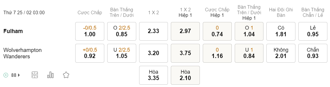 Tỉ lệ kèo Fulham vs Wolves