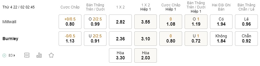 Soi kèo hiệp 1 Millwall vs Burnley: 1.08*0*0.80