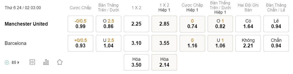 Soi kèo hiệp 1 MU vs Barcelona: 0.74*0*1.16