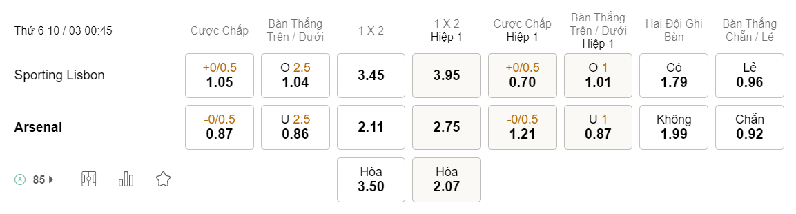Soi kèo hiệp 1 Sporting Lisbon vs Arsenal: 0.70*0/0.5*1.21