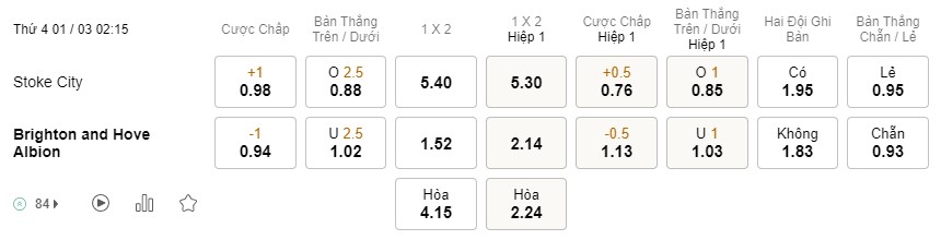 Soi kèo hiệp 1 Stoke vs Brighton: 0.76*0.5*1.13