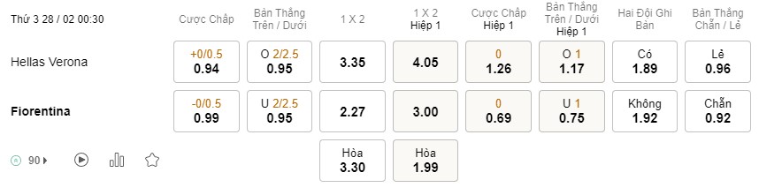 Soi kèo châu Á Verona vs Fiorentina: 0.94*0/0.5*0.99