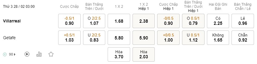 Soi kèo hiệp 1 Villarreal vs Getafe: 0.90*0/0.5*1.00