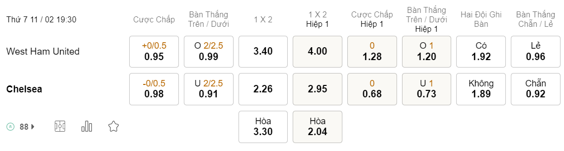 Soi kèo châu Á West Ham vs Chelsea: 0.95*0/0.5*0.98